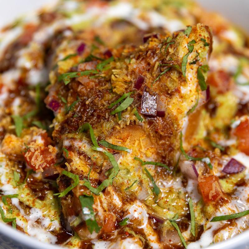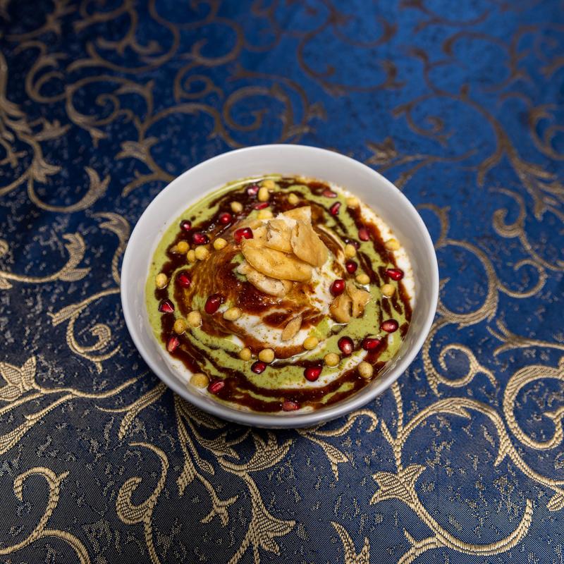 North Indian street food snack topped with sweet yogurt, pomegranate tamarind & mint • Contains Gluten, Contains Nuts