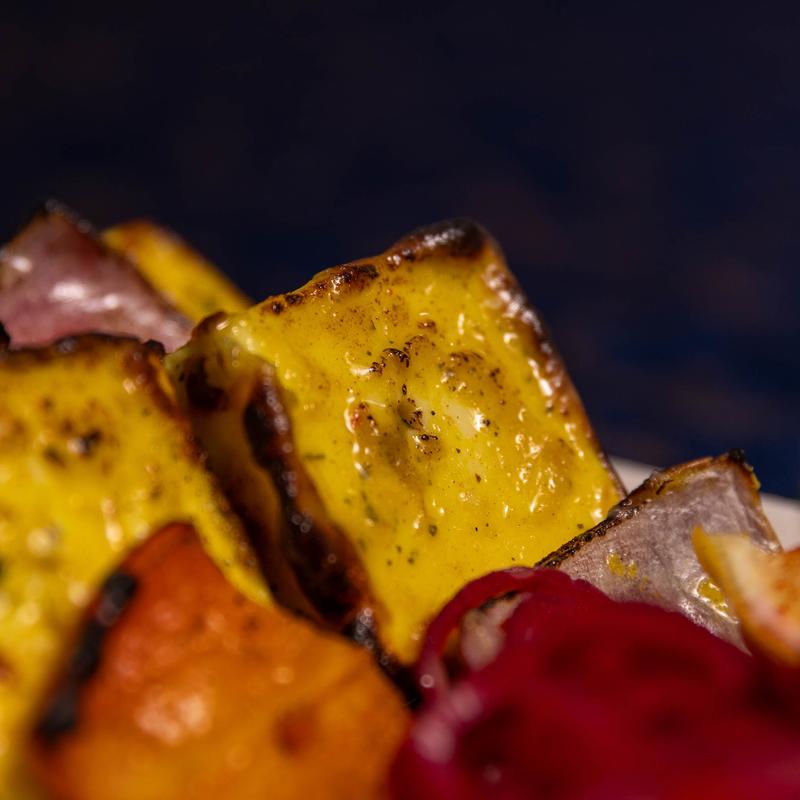Paneer cubes marinated in yellow marination cooked in clay oven • Nut Free