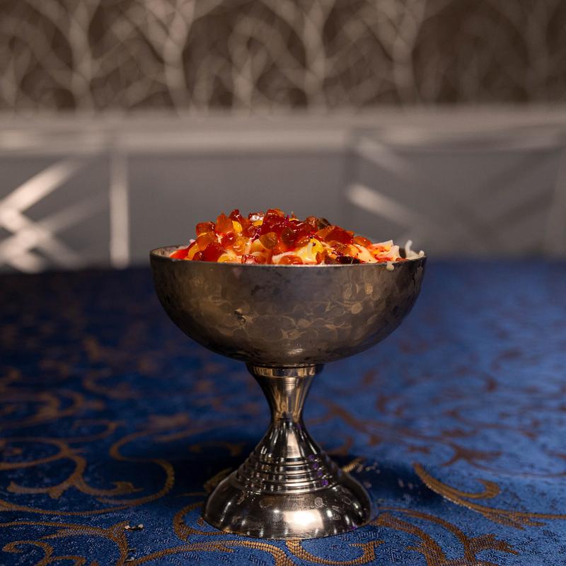Sweet yogurt mousse, sev tamarind chutney pomegranate • Contains Gluten, Contains Nuts