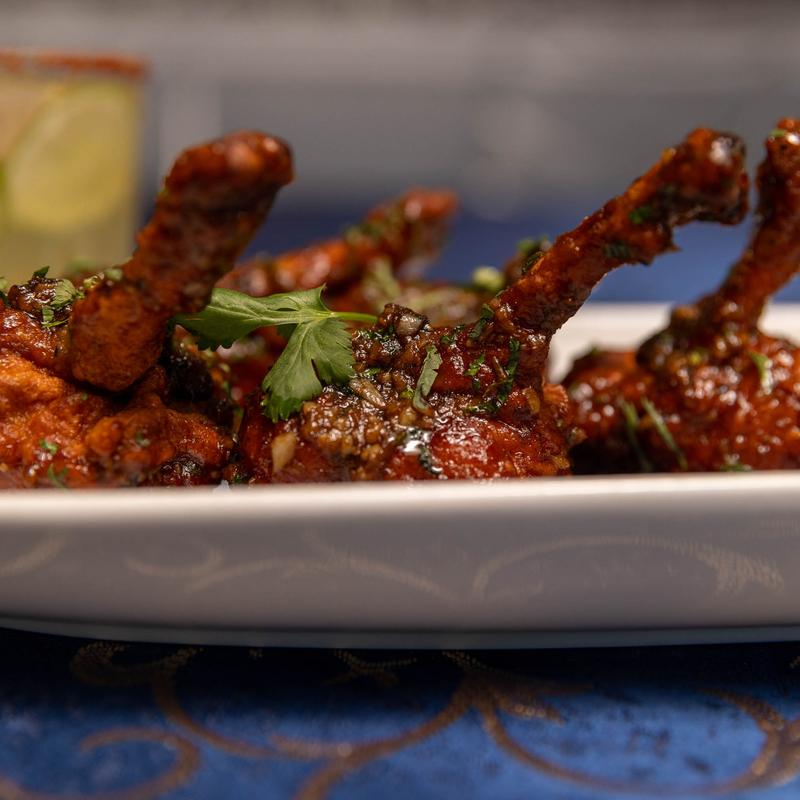 Frenched drumsticks marinated and tossed in chilli garlic sauce • Nut Free