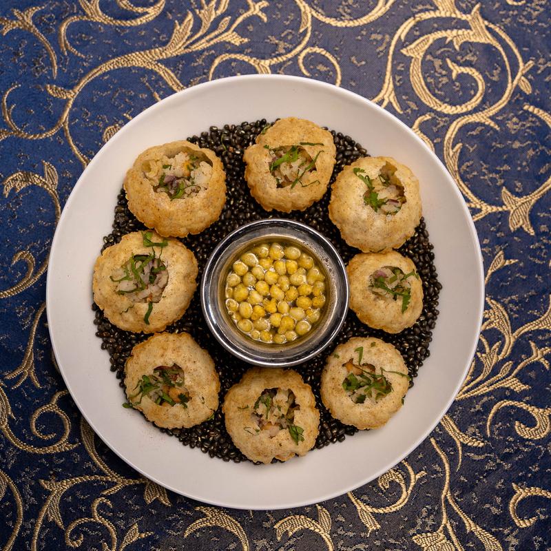 Crispy puris filled with potatoes, chickpeas served with spicy & tangy water • Contains Gluten