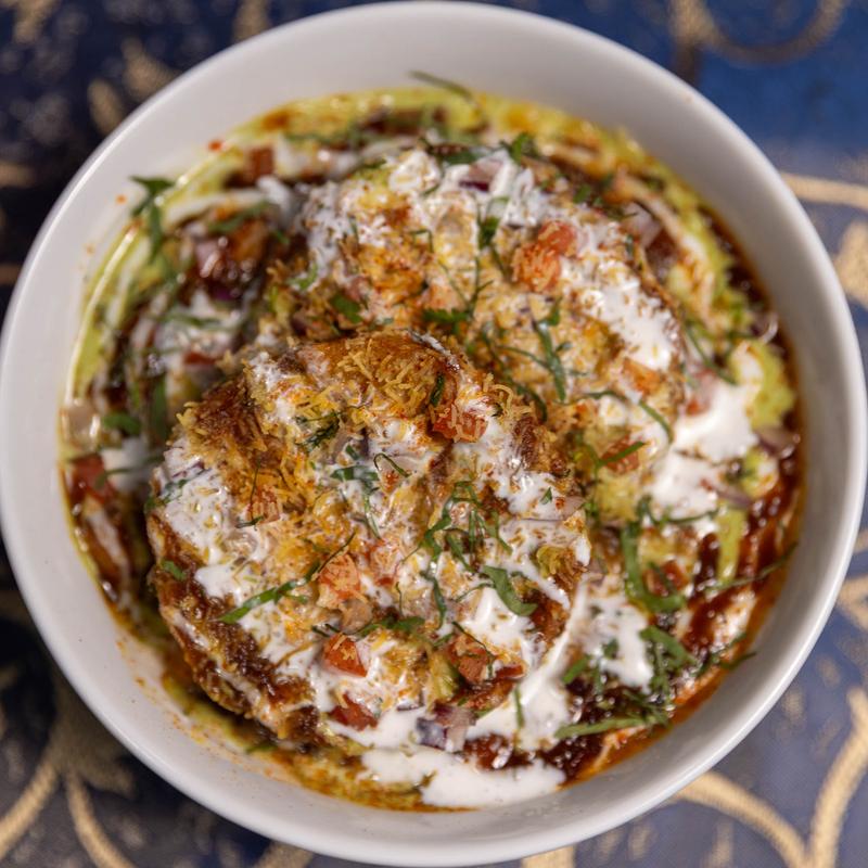 Deep fried lentil fritters dunked in creamy yogurt topped with mint & tamarind chutney • Nut Free